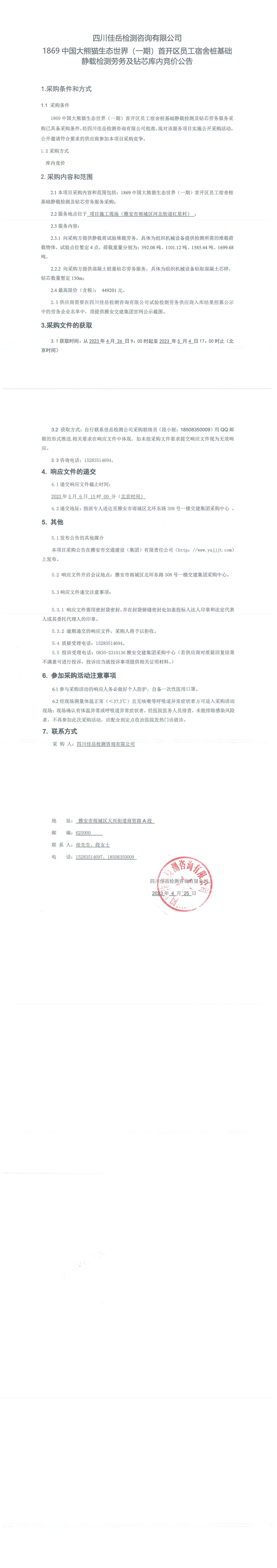 四川佳岳檢測(cè)咨詢有限公司1869中國(guó)大熊貓生態(tài)世界(一期)首開區(qū)員工宿舍樁基礎(chǔ)靜載檢測(cè)勞務(wù)及磚芯庫(kù)內(nèi)競(jìng)價(jià)公告