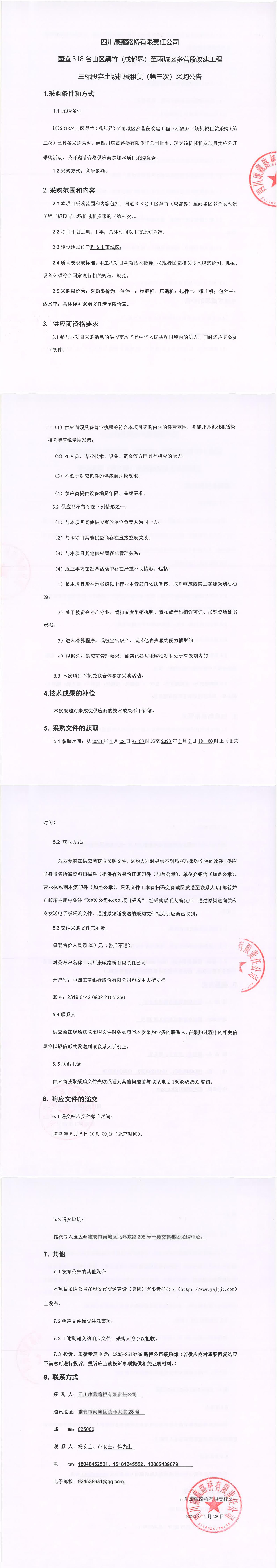 四川康藏路橋有限責(zé)任公司國(guó)道318名山區(qū)黑竹(成都界)至雨城區(qū)多營(yíng)段改建工程三標(biāo)段棄土場(chǎng)機(jī)械租賃(第三次)采購(gòu)公告