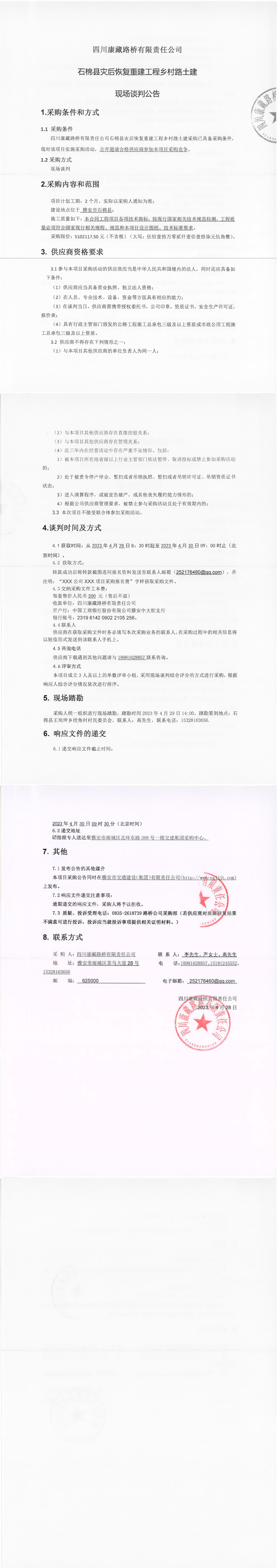 四川康藏路橋有限責任公司石棉縣災(zāi)后恢復(fù)重建工程鄉(xiāng)村路土建現(xiàn)場談判公告