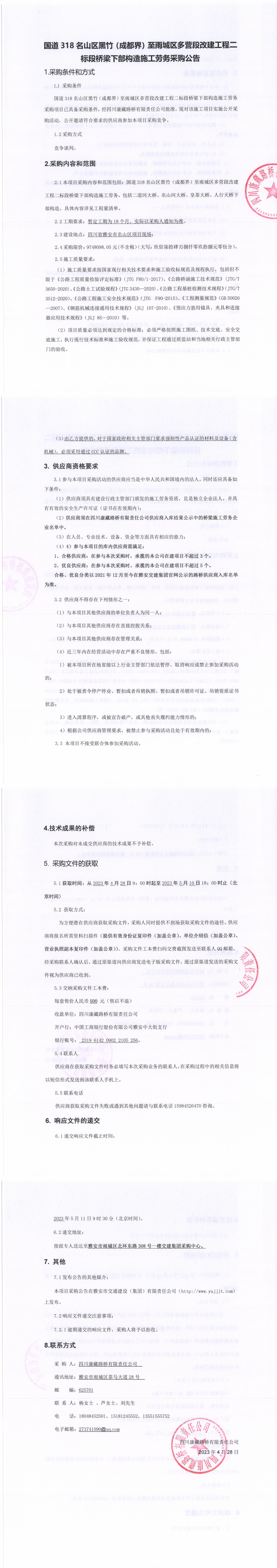 四川康藏路橋有限責(zé)任公司國道318名山區(qū)黑竹(成都界)至雨城區(qū)多營段改建工程二標(biāo)段橋梁下部構(gòu)造施工勞務(wù)采購公告