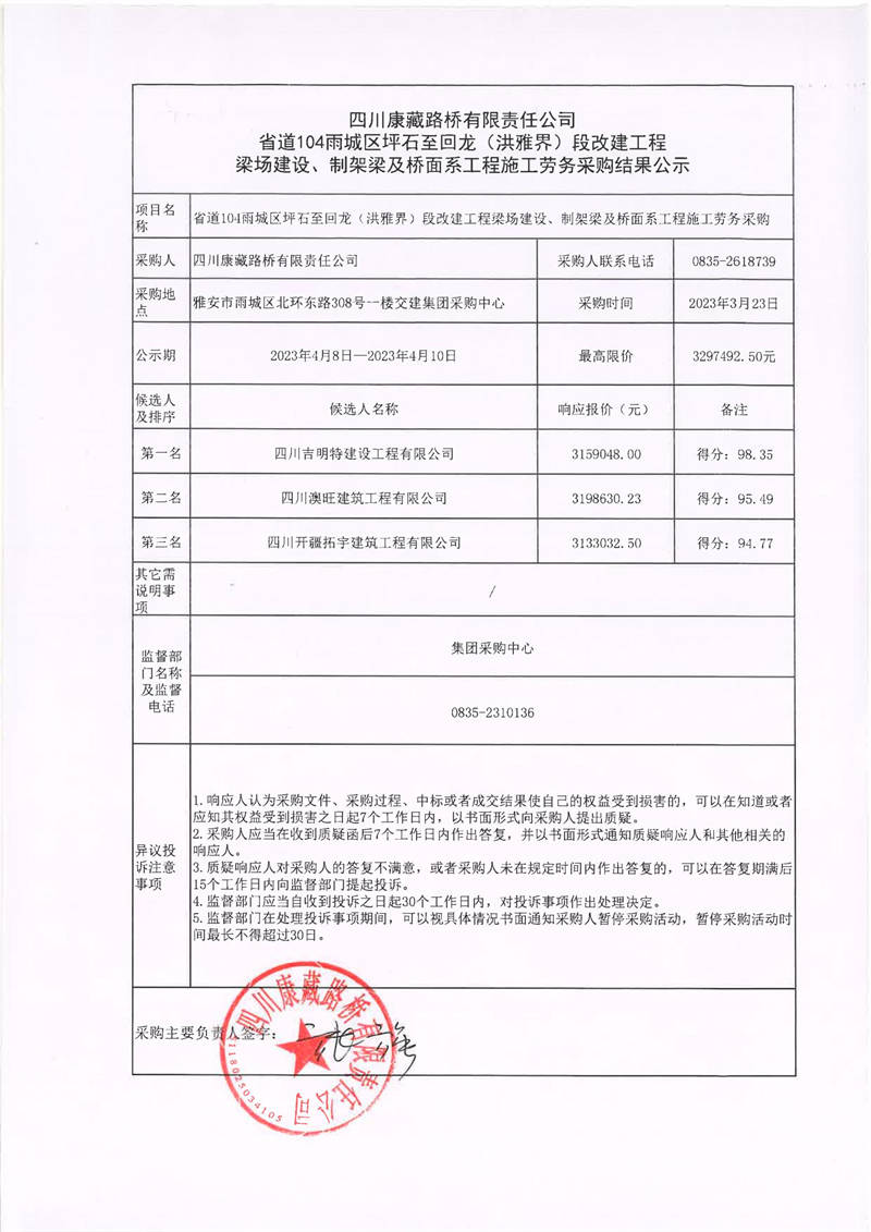 四川康藏路橋有限責(zé)任公司省道104雨城區(qū)坪石至回龍(洪雅界)段改建工程梁場(chǎng)建設(shè)、制架梁及橋面系工程施工勞務(wù)采購(gòu)結(jié)果公示
