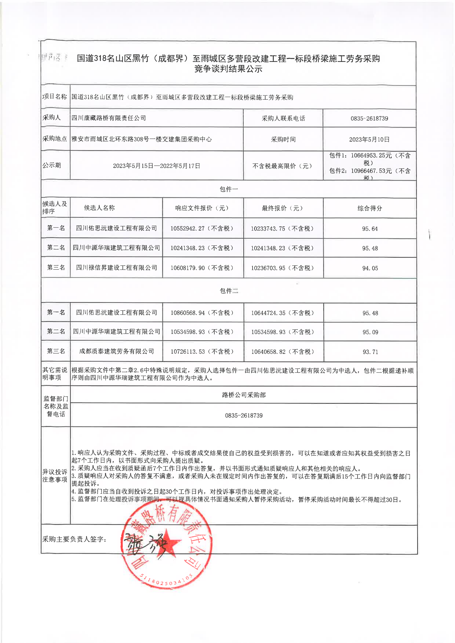 四川康藏路橋有限責任公司國道318名山區(qū)黑竹(成都界)雨城區(qū)多營段改建工程一標段橋梁施工勞務采購競爭談判結(jié)果公示