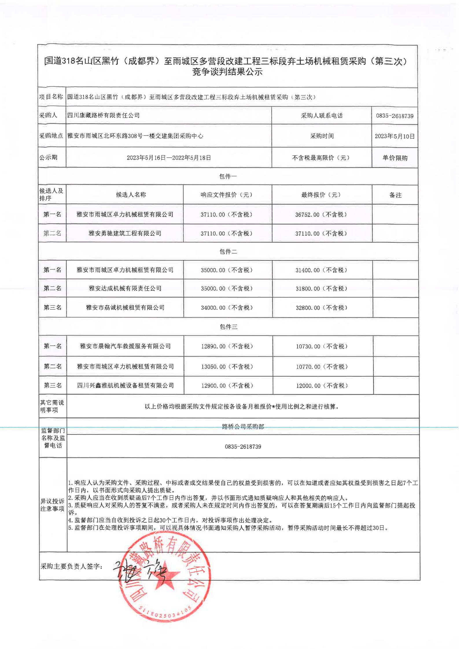 四川康藏路橋有限責任公司國道318名山區(qū)黑竹(成都界)至雨城區(qū)多營段改建工程三標段棄土場機械租賃采購(第三次)競爭談判結果公示