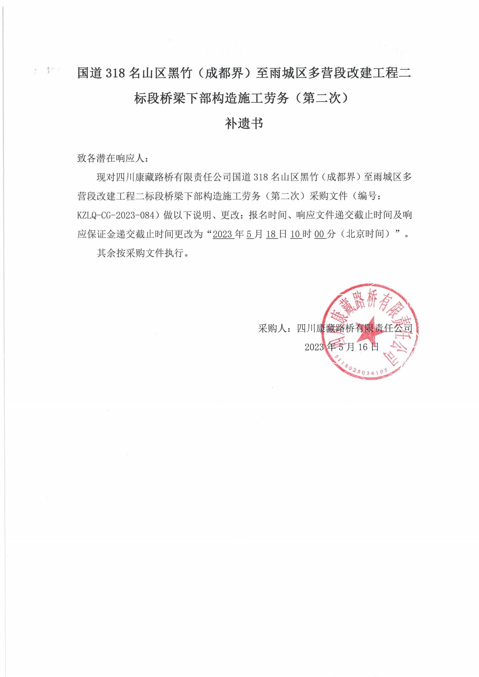 四川康藏路橋有限責(zé)任公司國道318名山區(qū)黑竹(成都界)至雨城區(qū)多營段改建工程二標(biāo)段橋梁下部構(gòu)造施工勞務(wù)(第二次)補(bǔ)遺書