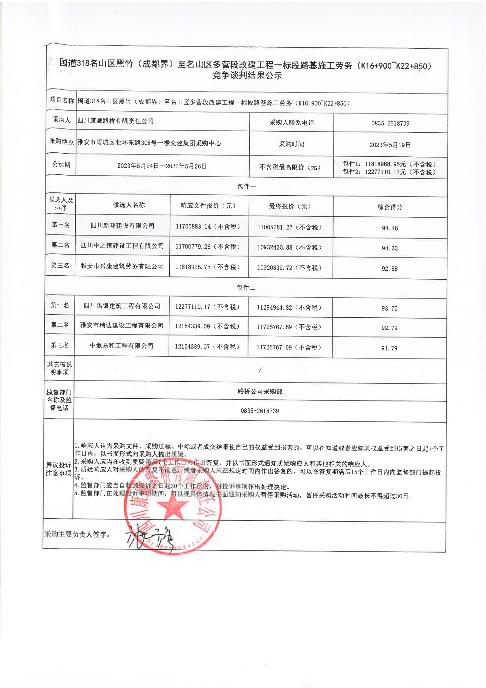 四川康藏路橋有限責(zé)任公司國道318名山區(qū)黑竹(成都界)至雨城區(qū)多營段改建工程一標(biāo)段路基施工勞務(wù)(K22+850~K26+604.5)競(jìng)爭(zhēng)談判結(jié)果公示