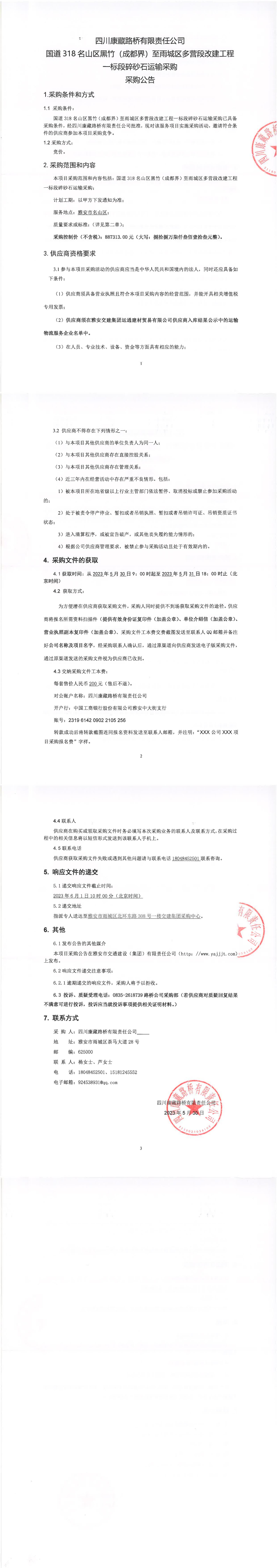 四川康藏路橋有限責(zé)任公司國道318名山區(qū)黑竹(成都界)至雨城區(qū)多營段改建工程一標(biāo)段碎砂石運(yùn)輸采購補(bǔ)遺書(一)