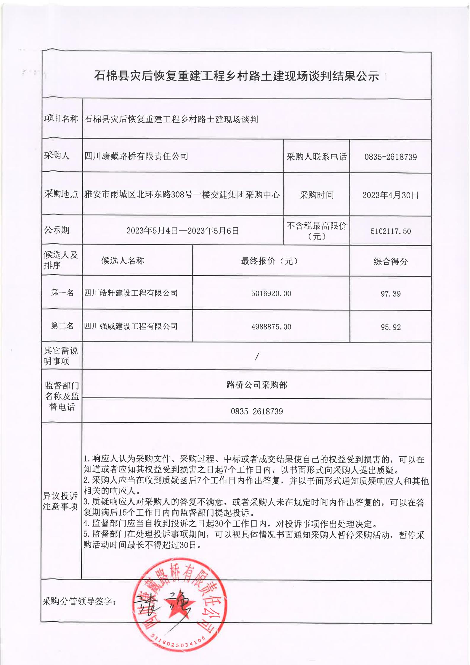 四川康藏路橋有限責(zé)任公司石棉縣災(zāi)后恢復(fù)重建工程鄉(xiāng)村路土建現(xiàn)場談判結(jié)果公示
