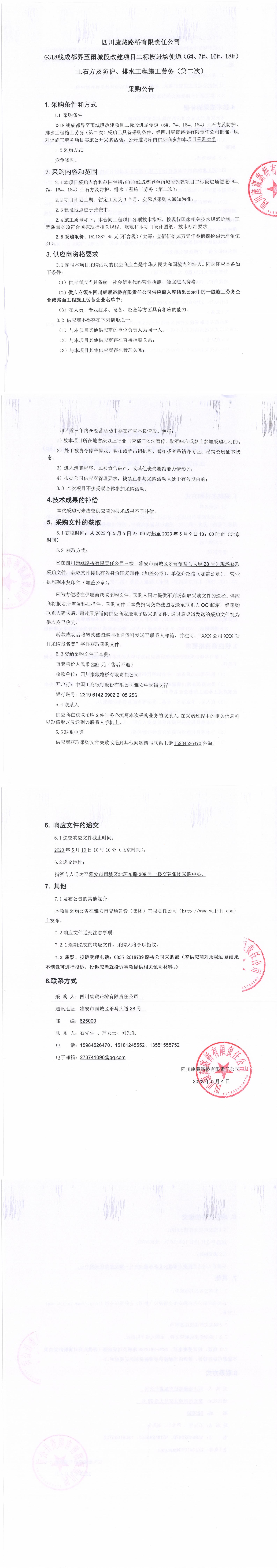 四川康藏路橋有限責(zé)任公司G318線成都至雨城段改建項(xiàng)目二標(biāo)段進(jìn)場(chǎng)便道(6#、7#、16#、18#)土石方及防護(hù)、排水工程施工勞務(wù)(第二次)采購(gòu)公告