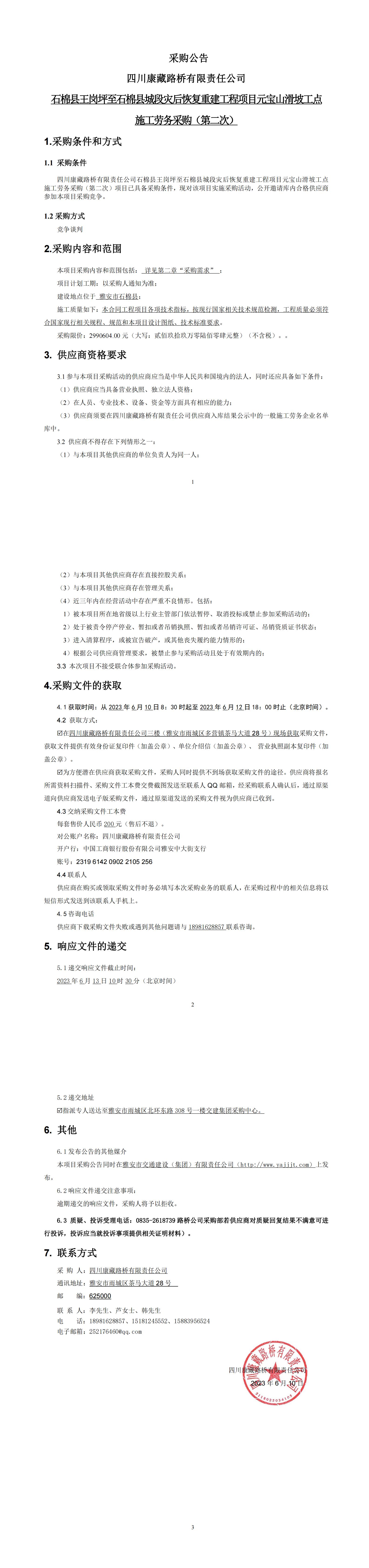 四川康藏路橋有限責(zé)任公司石棉縣王崗坪至石棉縣城段災(zāi)后恢復(fù)重建工程項目元寶山滑坡工點施工勞務(wù)采購(第二次)