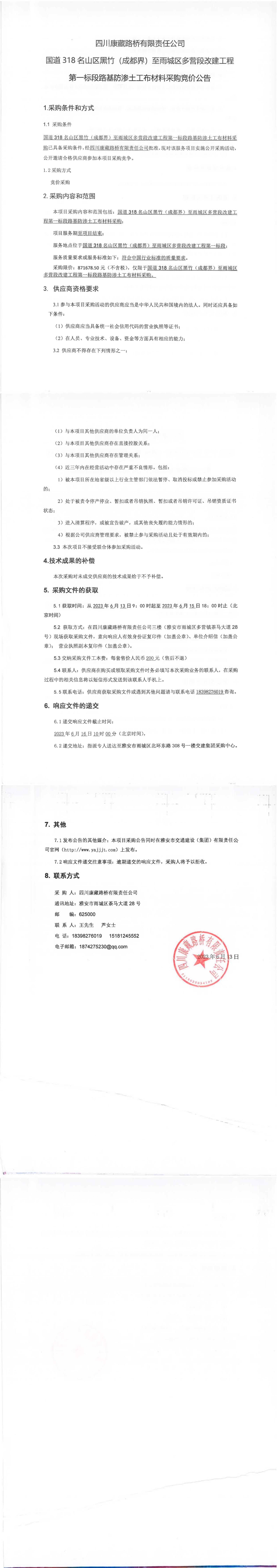 四川康藏路橋有限責(zé)任公司國(guó)道318名山區(qū)黑竹(成都界)至雨城區(qū)多營(yíng)段改建工程第一標(biāo)段路基防滲土工布材料采購(gòu)競(jìng)價(jià)公告