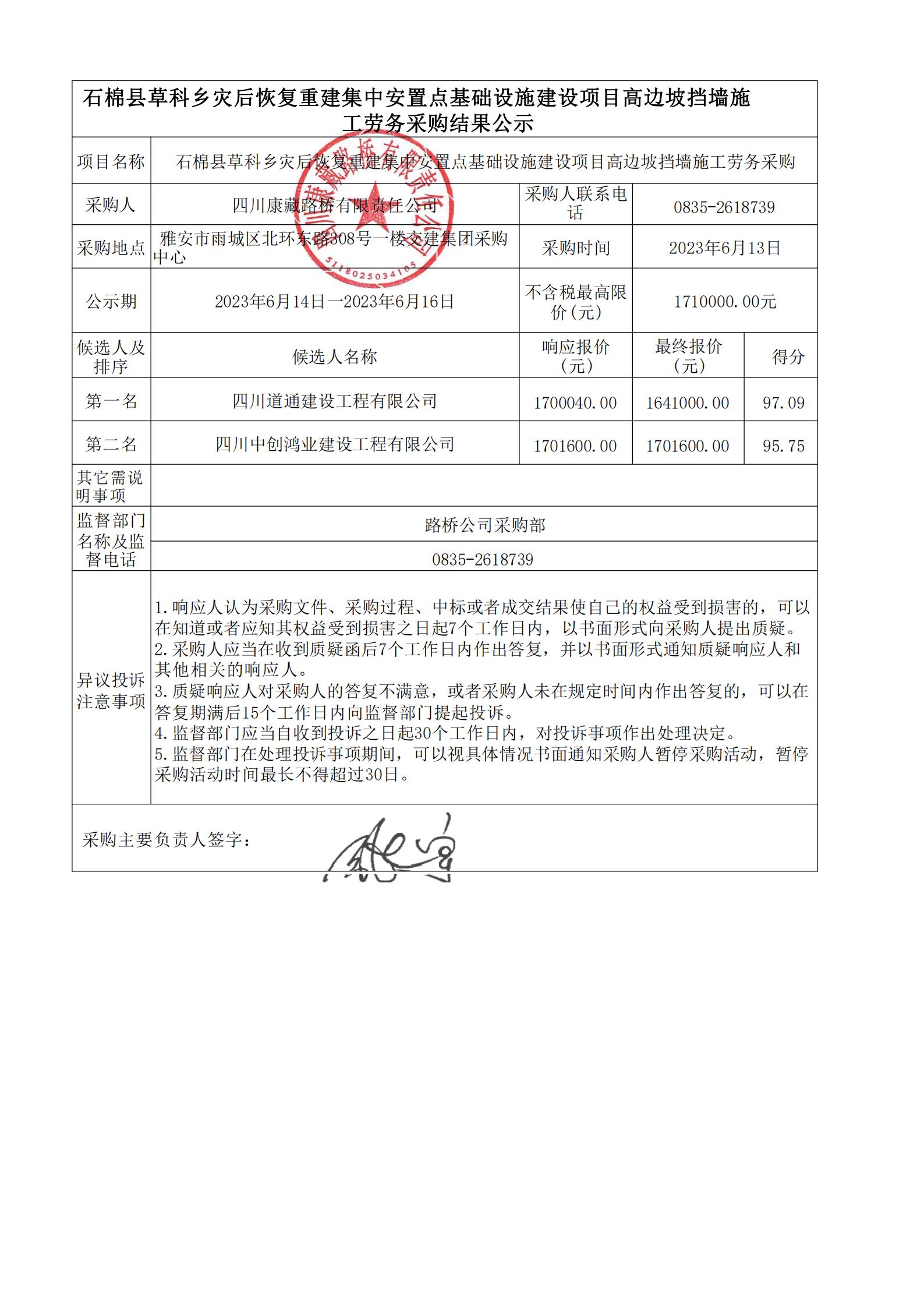 四川康藏路橋有限責任公司石棉縣草科鄉(xiāng)災(zāi)后恢復(fù)重建集中安置點建設(shè)項目農(nóng)家村村委會邊坡防護工程施工勞務(wù)采購(第三次)結(jié)果公示
