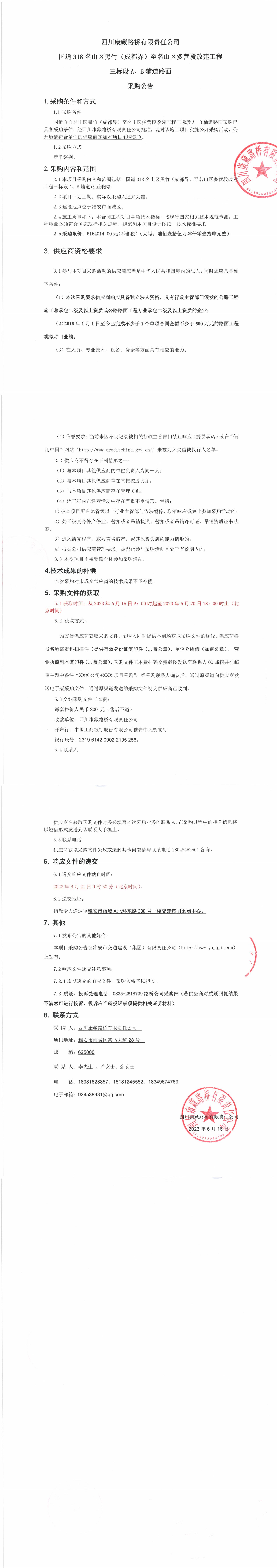 四川康藏路橋有限責(zé)任公司國道318名山區(qū)黑竹(成都界)至名山區(qū)多營段改建工程三標段A,B輔道路面采購公告