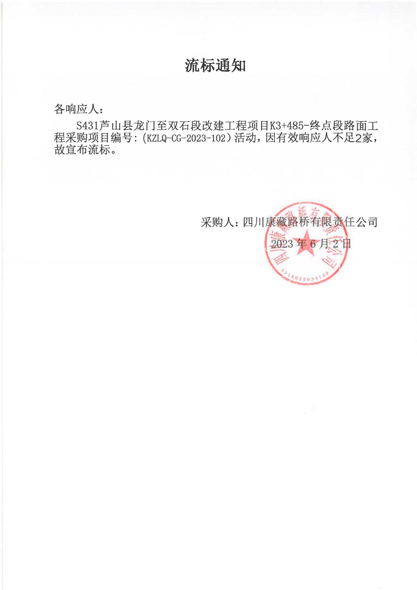 四川康藏路橋有限責(zé)任公司S431蘆山縣龍門至雙石段改建工程項(xiàng)目K3+485-終點(diǎn)段路面工程采購(gòu)項(xiàng)目流標(biāo)通知