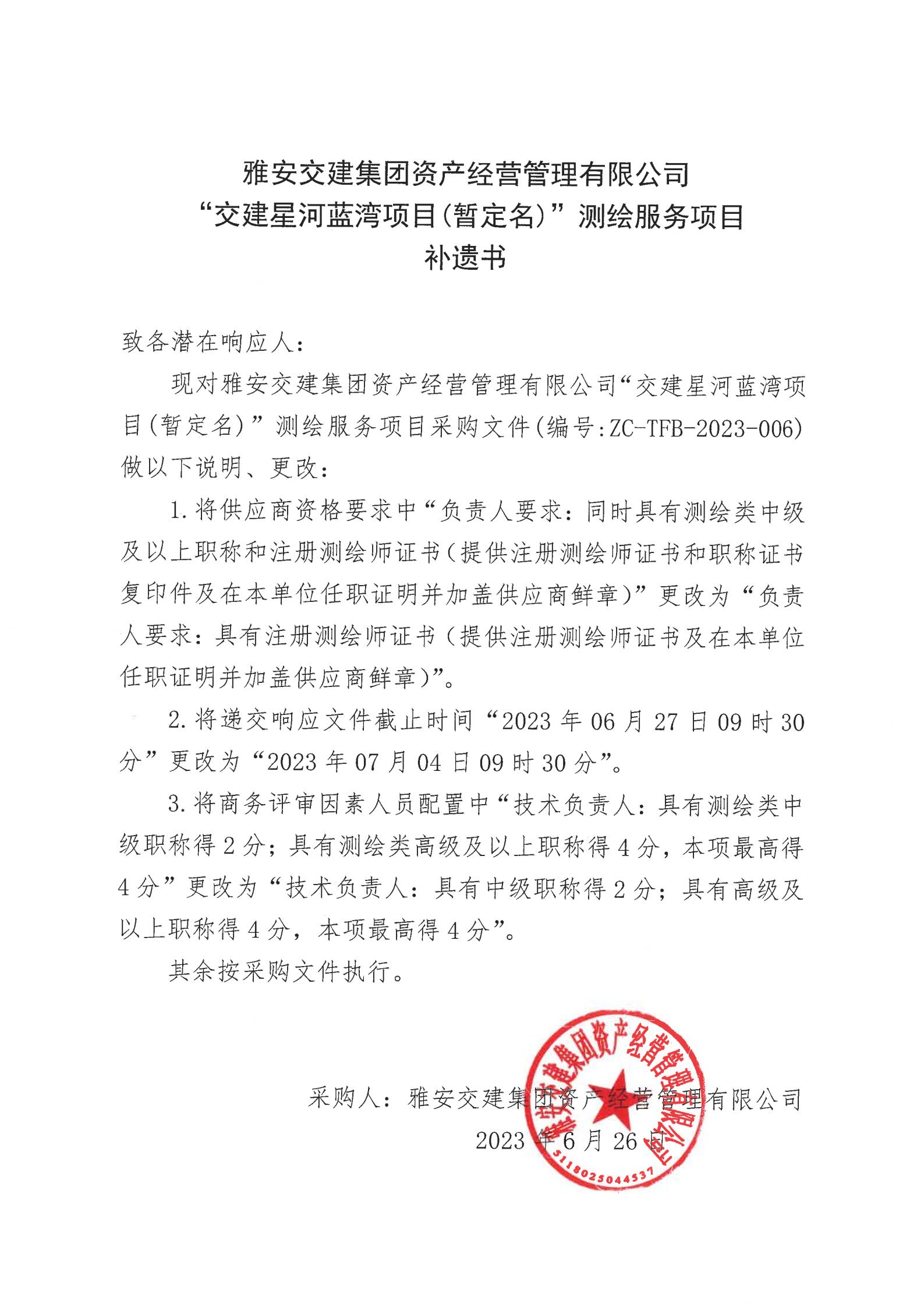 雅安交建集團(tuán)資產(chǎn)經(jīng)營(yíng)管理有限公司“交建星河藍(lán)灣項(xiàng)目(暫定名)”測(cè)繪服務(wù)項(xiàng)目補(bǔ)遺書