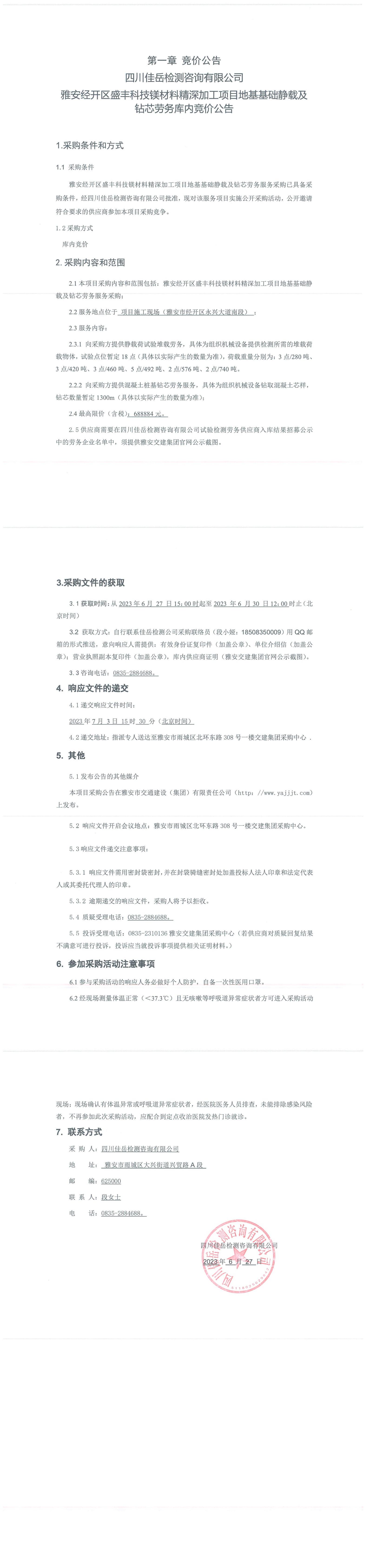 四川佳岳檢測咨詢有限公司雅安經(jīng)開區(qū)盛豐科技鎂材料精深加工項(xiàng)目地基基礎(chǔ)靜載及鉆芯勞務(wù)庫內(nèi)競價公告