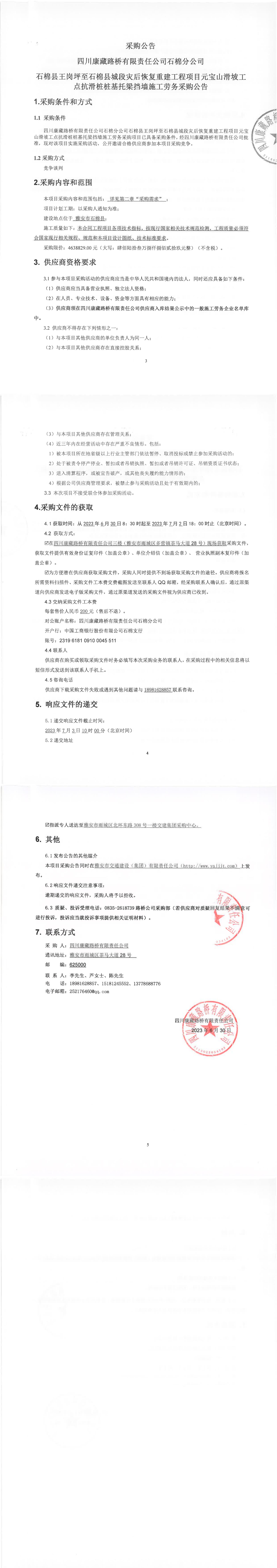 四川康藏路橋有限責(zé)任公司石棉縣王崗坪至石棉縣城段災(zāi)后恢復(fù)重建工程項目元寶山滑坡工點抗滑樁樁基托梁擋墻施工勞務(wù)采購公告