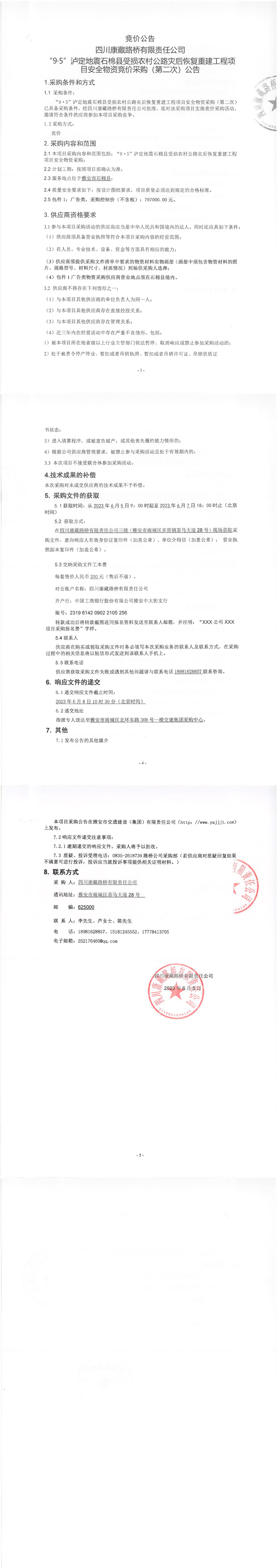 四川康藏路橋有限責(zé)任公司“9·5”瀘定地震石棉縣受損農(nóng)村公路災(zāi)后恢復(fù)重建工程項目安全物資競價采購(第二次)公告