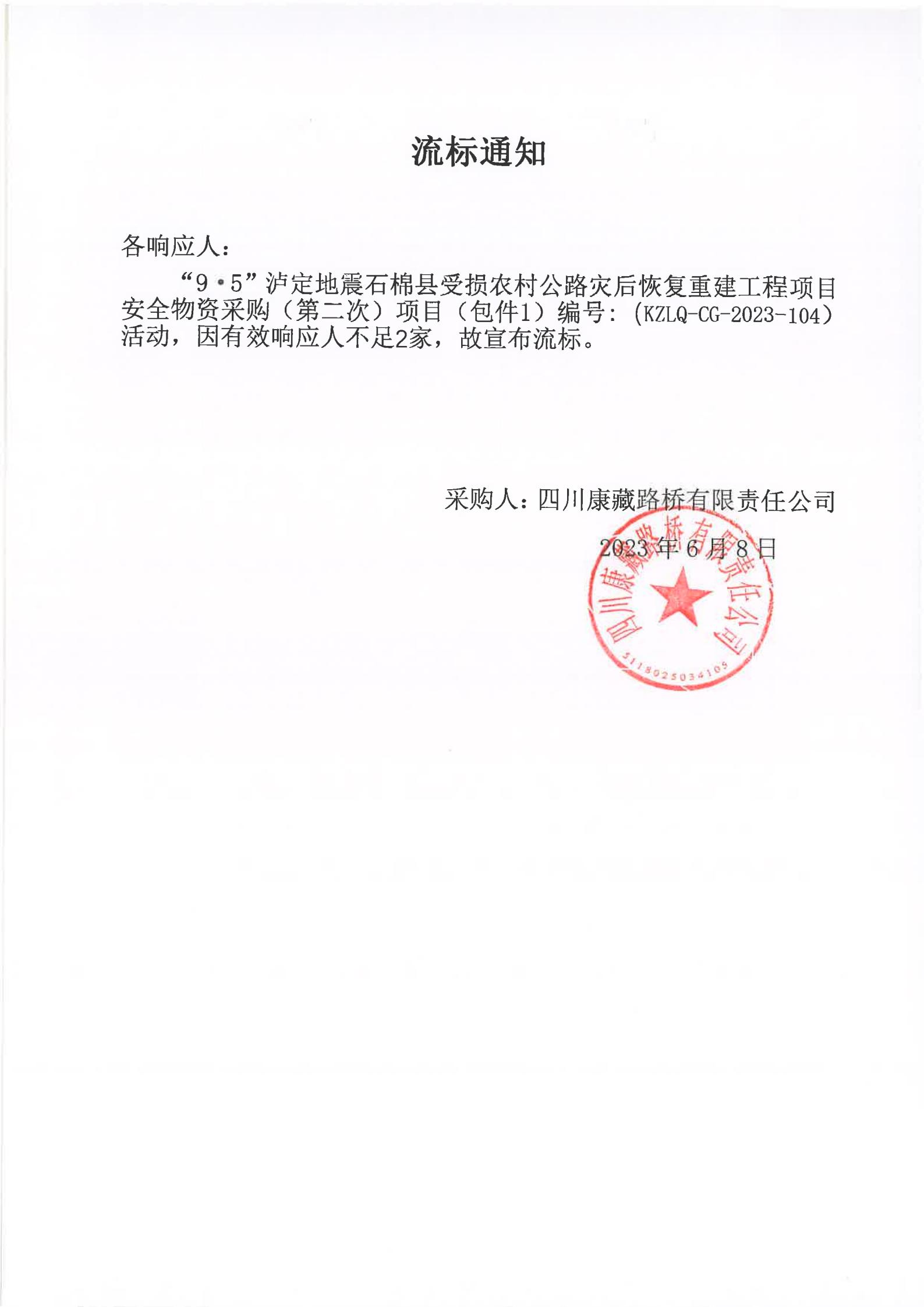 四川康藏路橋有限責(zé)任公司“9·5”瀘定地震石棉縣受損農(nóng)村公路災(zāi)后恢復(fù)重建工程項(xiàng)目安全物資競價采購(第二次)流標(biāo)通知