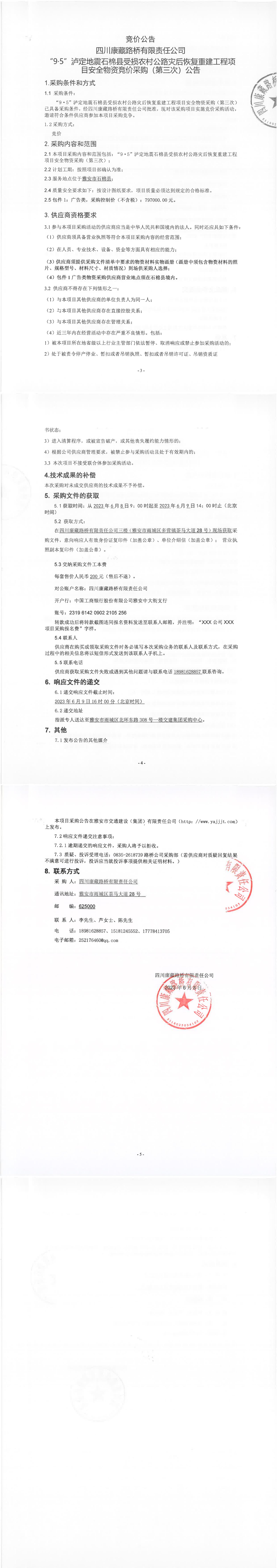 四川康藏路橋有限責任公司“9·5”瀘定地震石棉縣受損農村公路災后恢復重建工程項目安全物資競價采購(第三次)公告