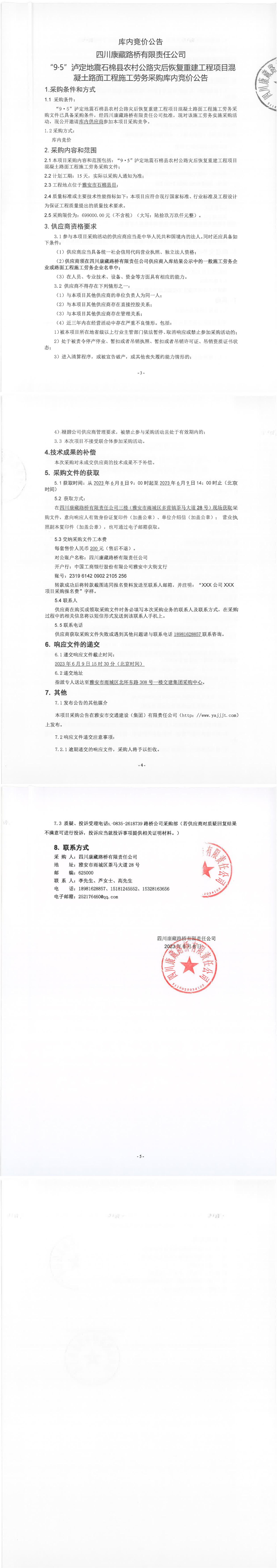 四川康藏路橋有限責(zé)任公司“9·5”瀘定地震石棉縣農(nóng)村公路災(zāi)后恢復(fù)重建工程項目混凝土路面工程施工勞務(wù)采購庫內(nèi)競價公告