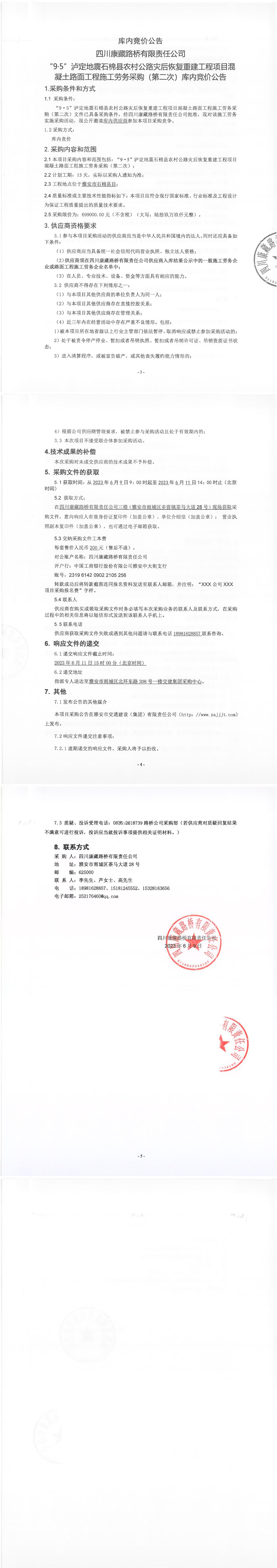 四川康藏路橋有限責(zé)任公司“9·5”瀘定地震石棉縣農(nóng)村公路災(zāi)后恢復(fù)重建工程項(xiàng)目混凝土路面工程施工勞務(wù)采購(第二次)庫內(nèi)競價公告