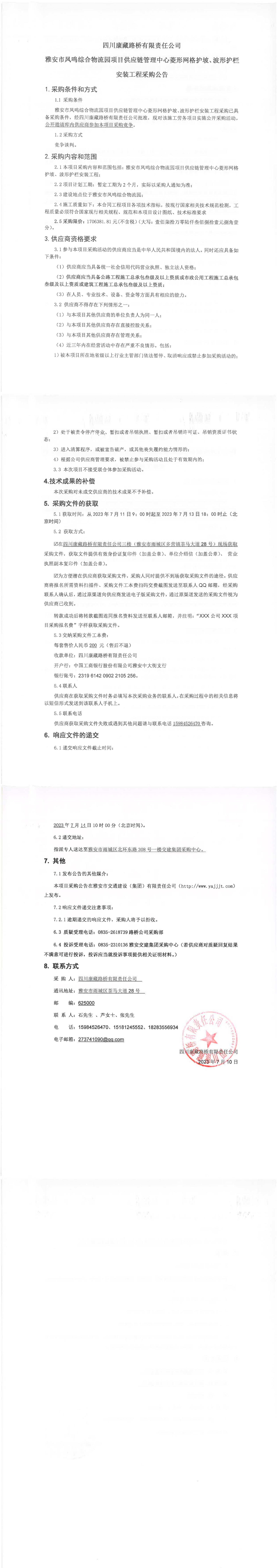 四川康藏路橋有限責(zé)任公司雅安市鳳鳴綜合物流園項(xiàng)目供應(yīng)鏈管理中心菱形網(wǎng)格護(hù)坡、波形護(hù)欄安裝工程采購(gòu)公告