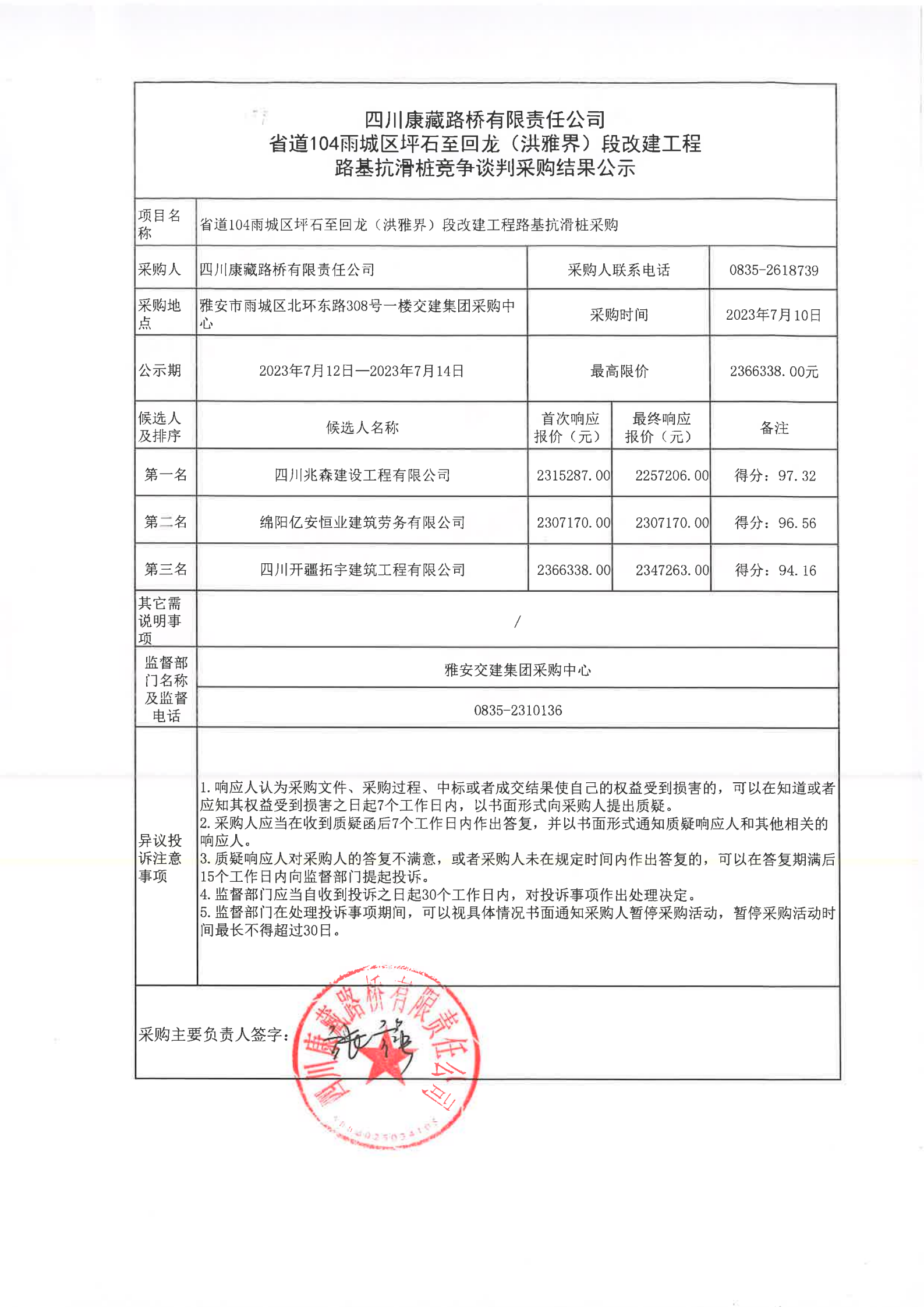 四川康藏路橋有限責任公司省道104雨城區(qū)坪石至回龍(洪雅界)段改建工程路基抗滑樁競爭談判采購結果公示