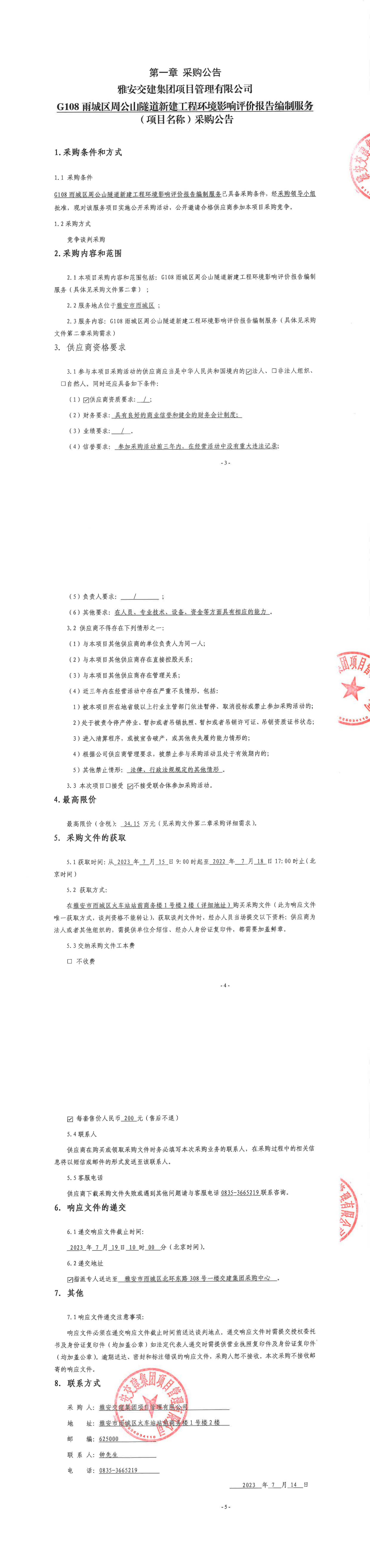 雅安交建集團(tuán)項目管理有限公司G108雨城區(qū)周公山隧道新建工程環(huán)境影響評價報告編制服務(wù)(項目名稱)采購公告