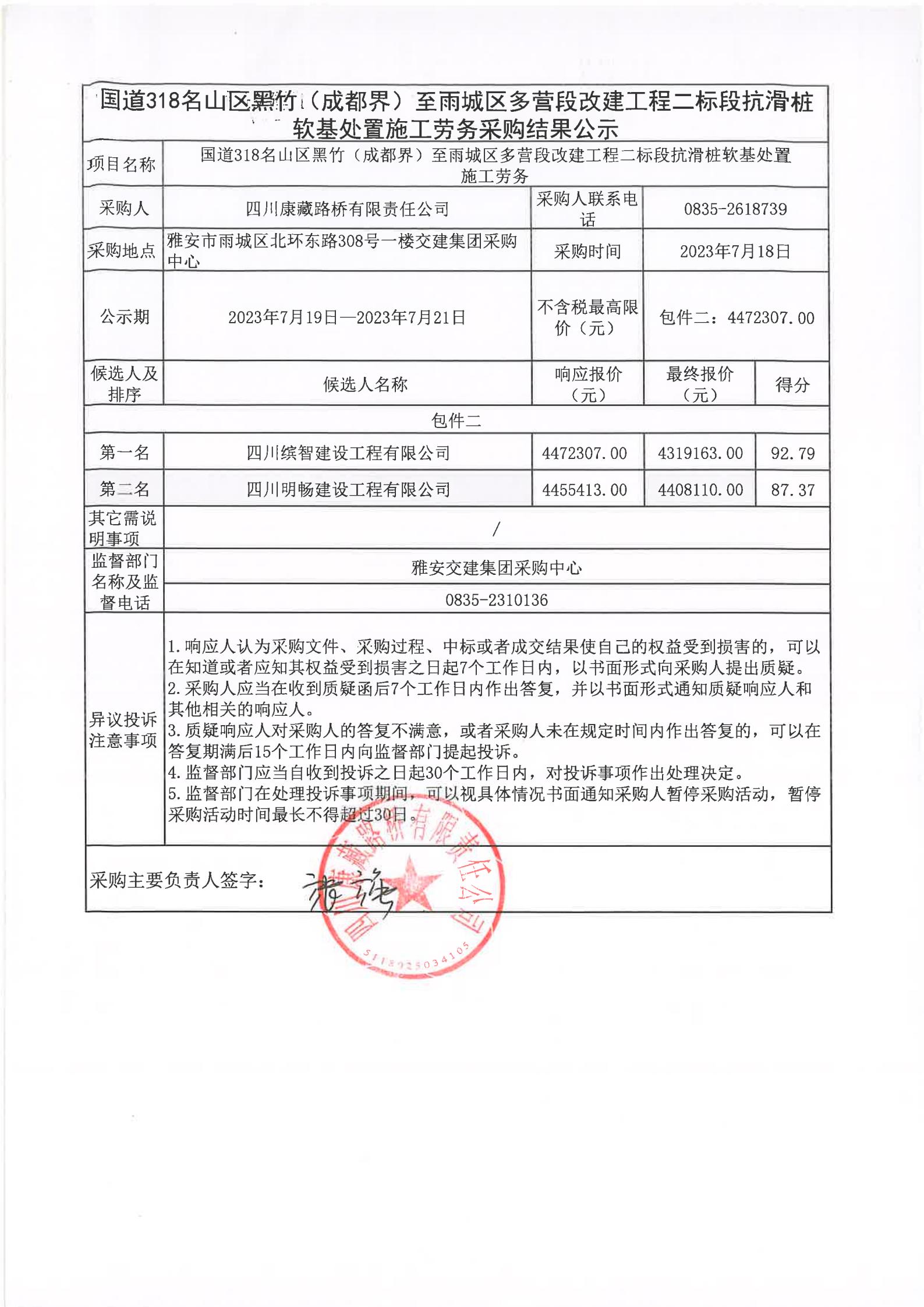 四川康藏路橋有限責(zé)任公司國道318名山區(qū)黑竹(成都界)至雨城區(qū)多營段改建工程二標段抗滑樁軟基處置施工勞務(wù)采購結(jié)果公示
