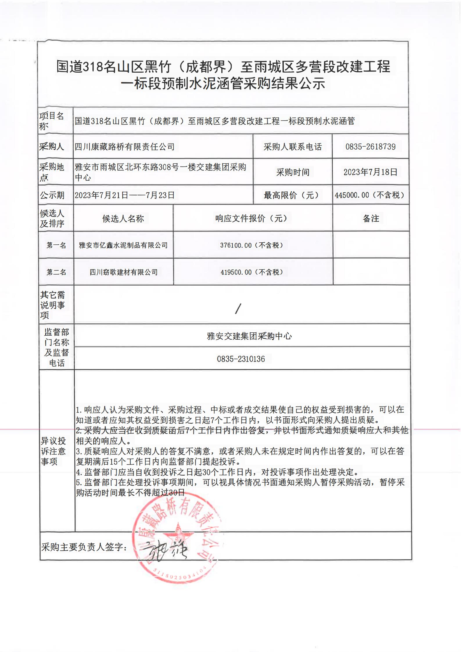 四川康藏路橋有限責(zé)任公司國道318名山區(qū)黑竹(成都界)至雨城區(qū)多營段改建工程一標(biāo)段預(yù)制水泥涵管采購結(jié)果公示