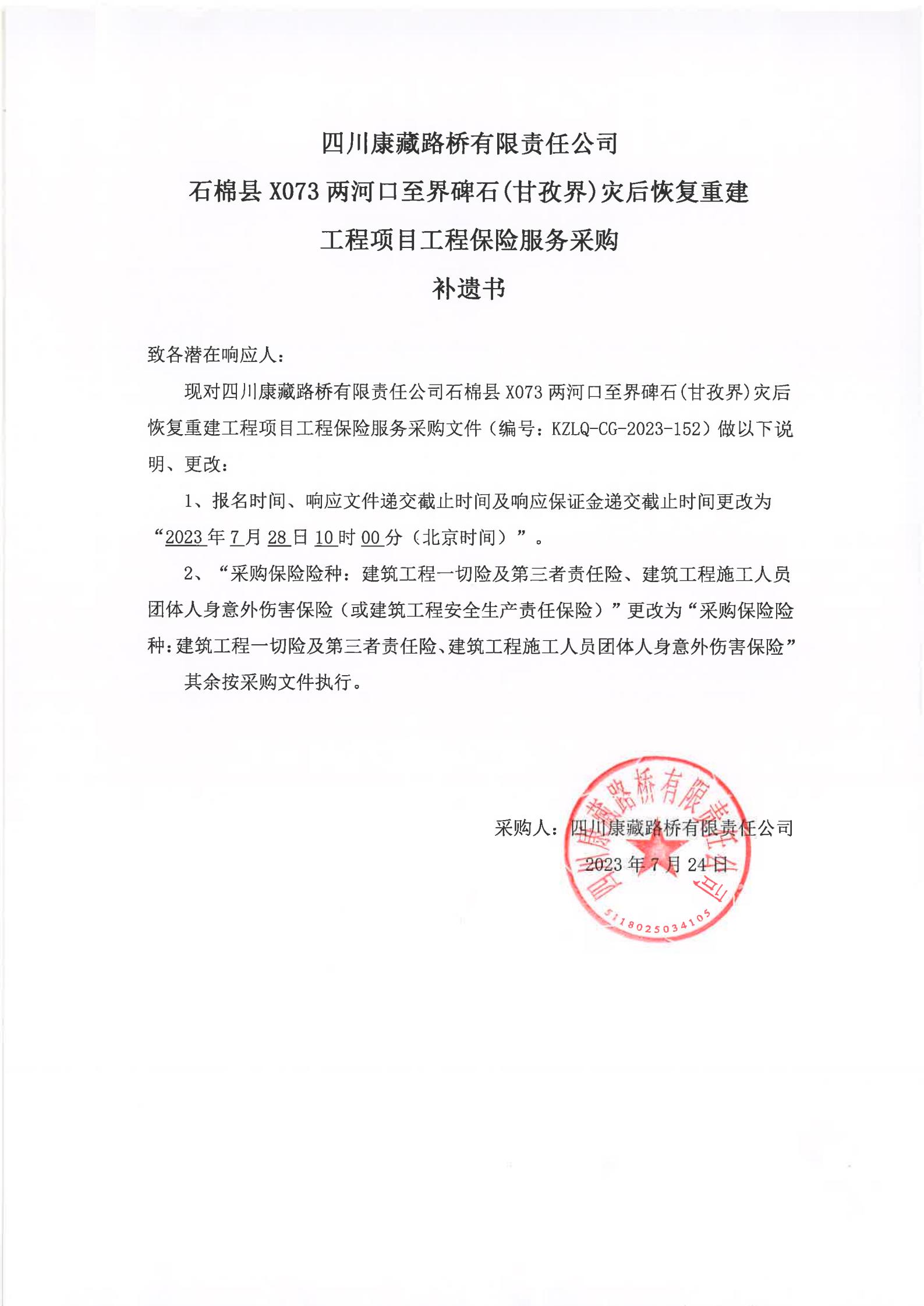 四川康藏路橋有限責(zé)任公司石棉縣X073兩河口至界碑石(甘孜界)災(zāi)后恢復(fù)重建工程項目工程保險服務(wù)采購補遺書