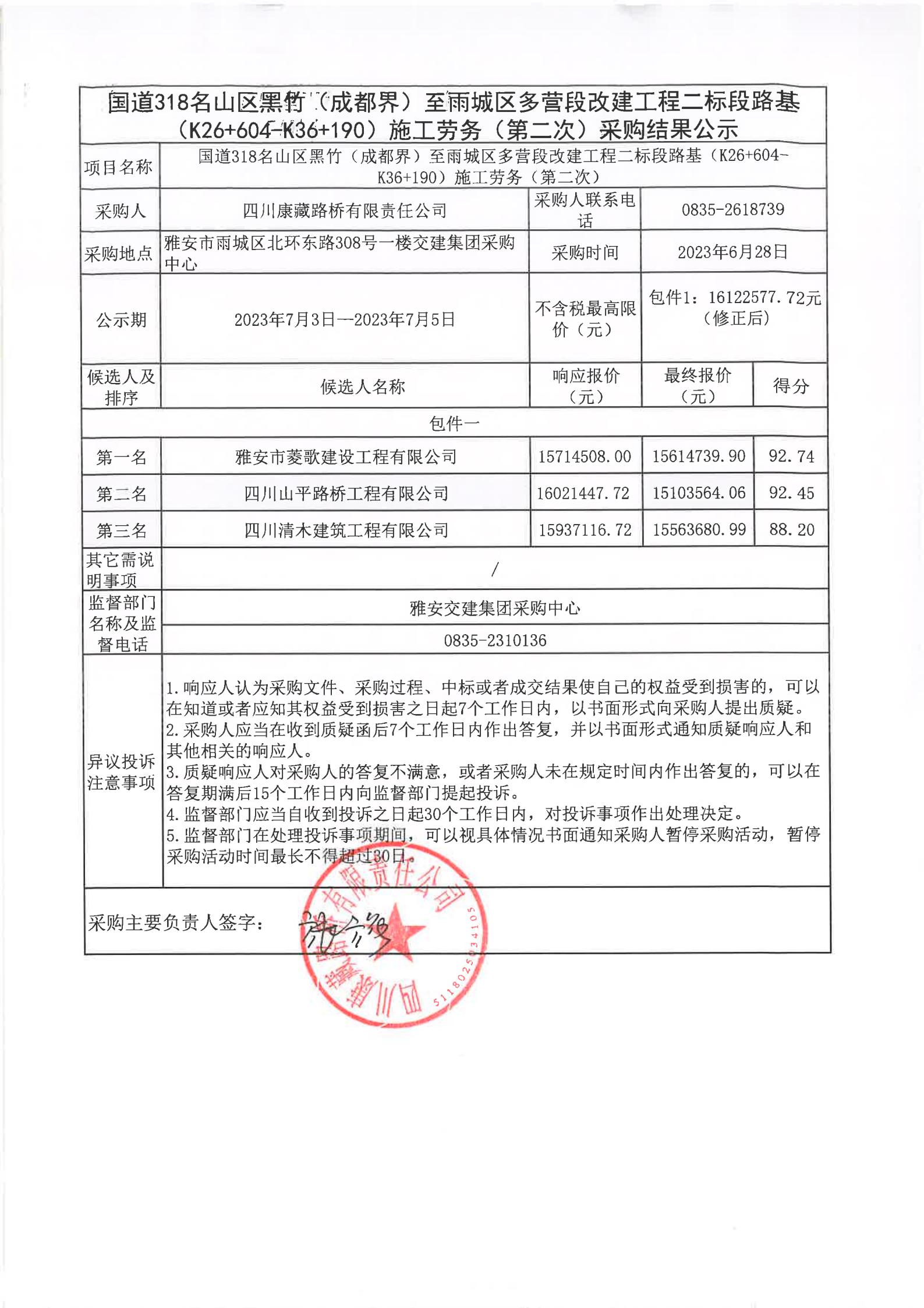 四川康藏路橋有限責任公司國道318名山區(qū)黑竹(成都界)至雨城區(qū)多營段改建工程二標段路基(K26+604-K36+190)施工勞務(第二次)采購結果公示