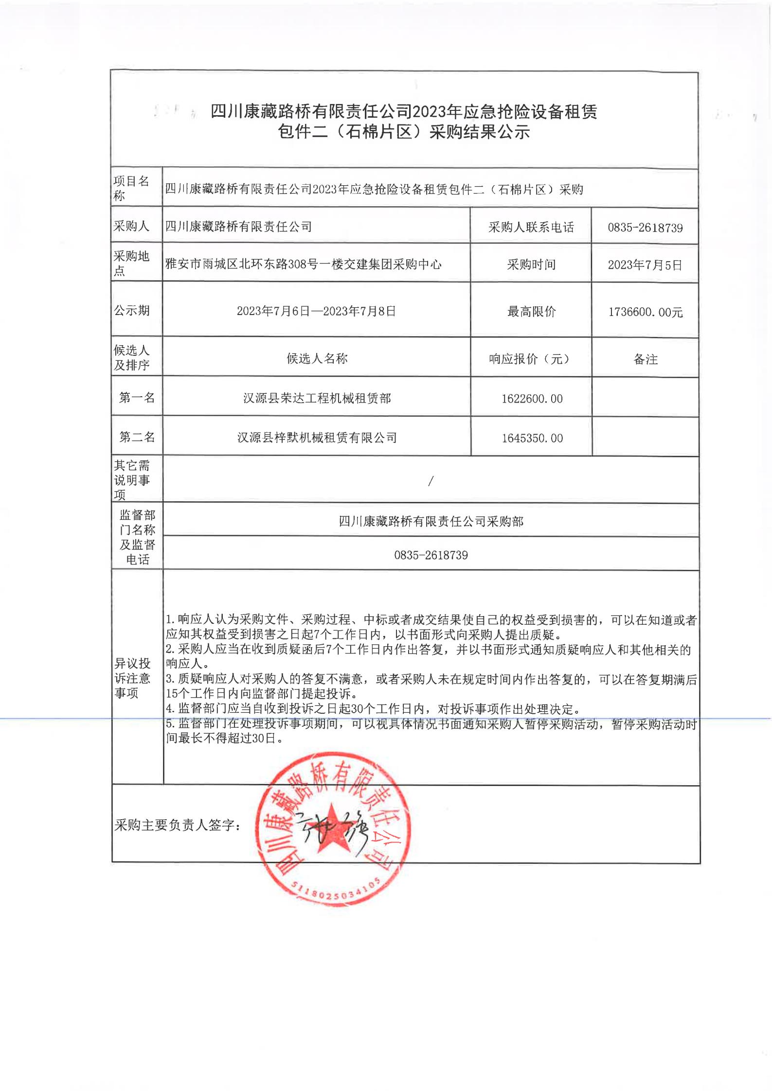 四川康藏路橋有限責(zé)任公司2023年應(yīng)急搶險(xiǎn)設(shè)備租賃包件二(石棉片區(qū))采購(gòu)結(jié)果公示
