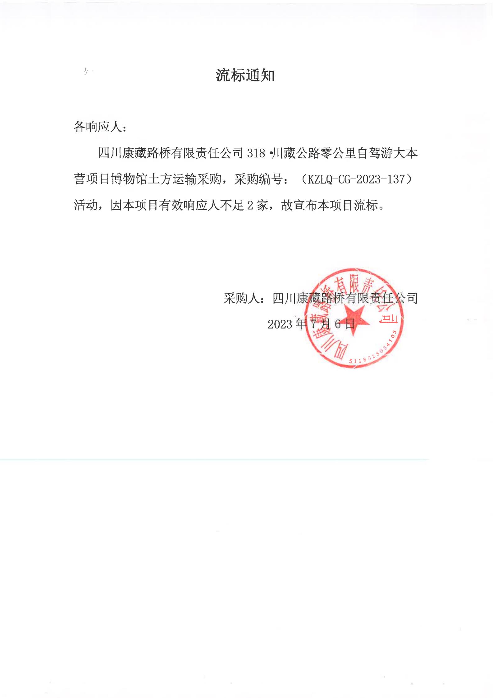 四川康藏路橋有限責(zé)任公司318·川藏公路零公里自駕游大本營項(xiàng)目博物館土方運(yùn)輸采購流標(biāo)通知