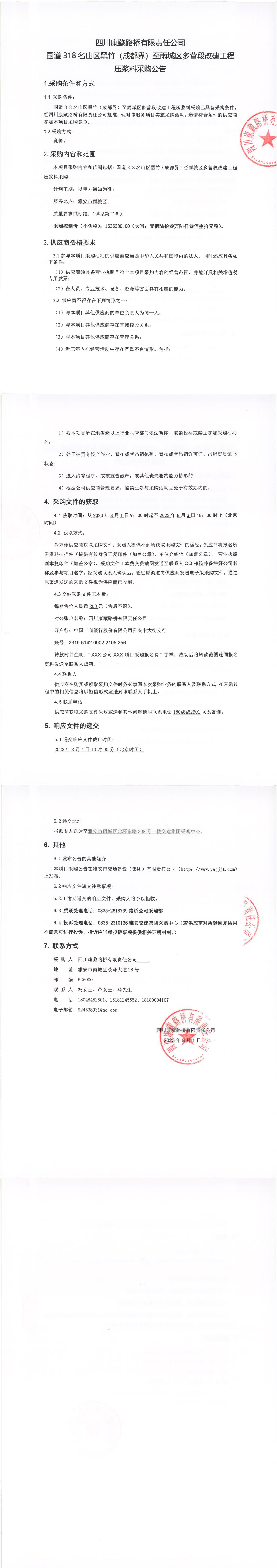 四川康藏路橋有限責(zé)任公司國道318名山區(qū)黑竹(成都界)至雨城區(qū)多營段改建工程壓漿料采購公告