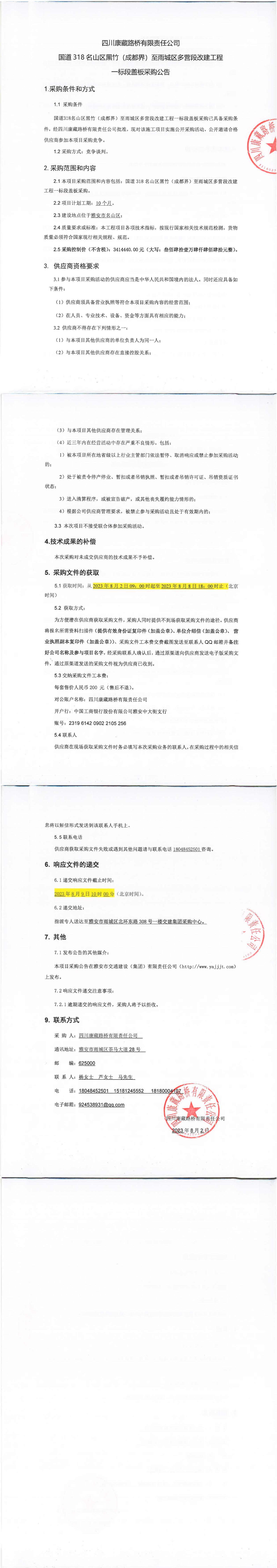 四川康藏路橋有限責任公司國道318名山區(qū)黑竹(成都界)至雨城區(qū)多營段改建工程一標段蓋板采購公告
