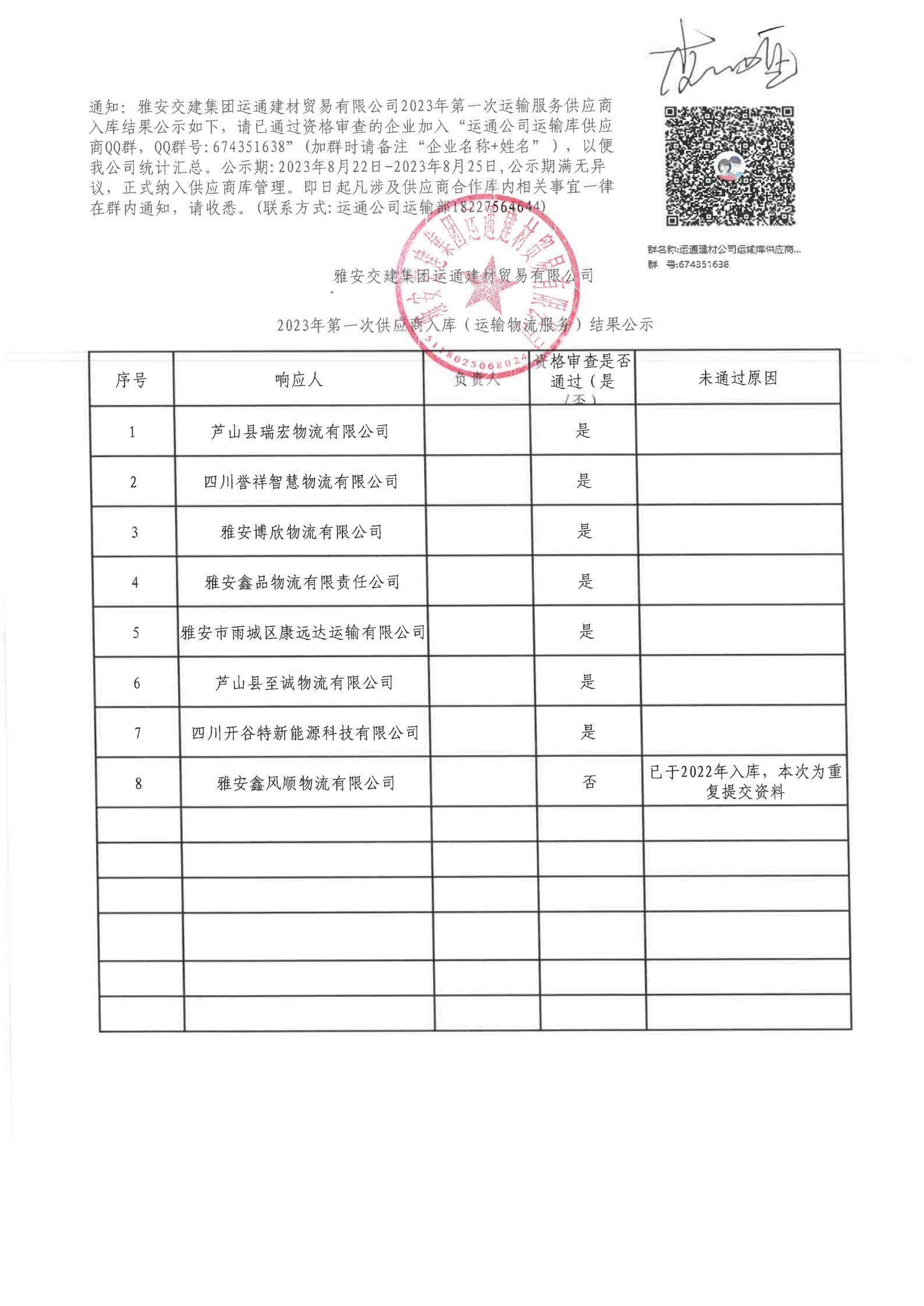 雅安交建集團運通建材貿(mào)易有限公司2023年第一次供應(yīng)商入庫(運輸物流服務(wù))結(jié)果公示