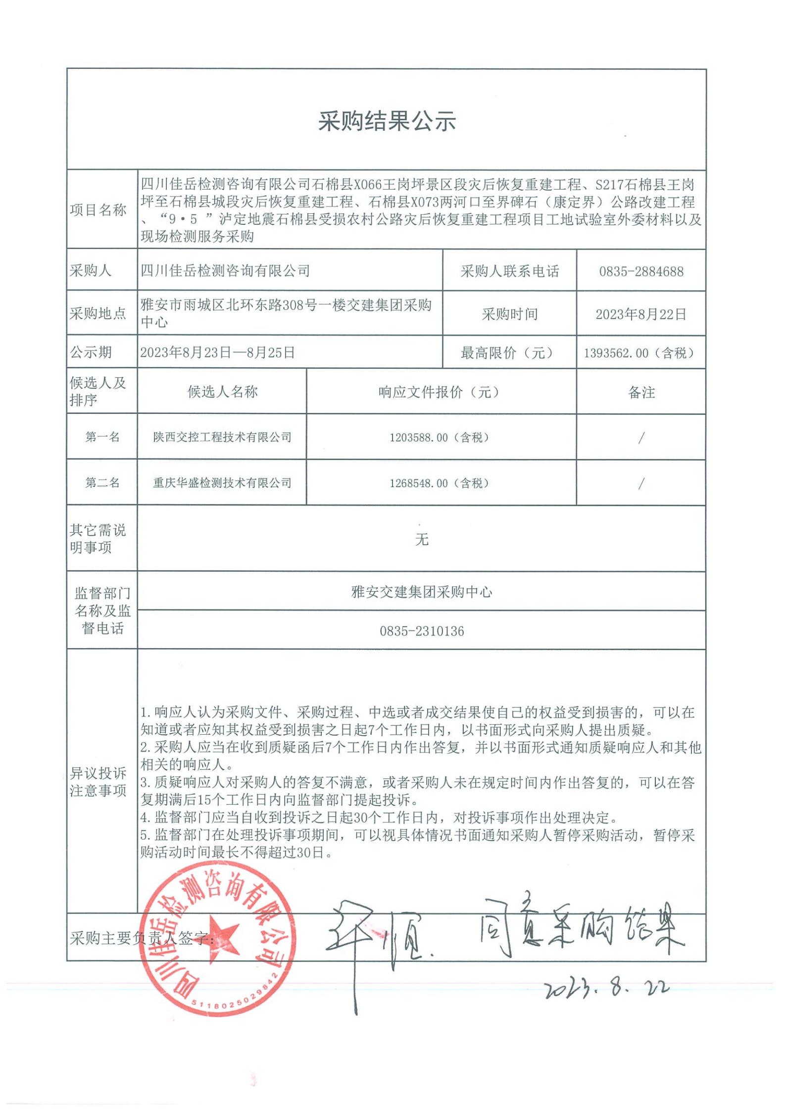 四川佳岳檢測咨詢有限公司石棉縣X066王崗坪至王崗坪景區(qū)段災后恢復重建工程、S217石棉縣王崗坪至石棉縣城段災后恢復重建工程、石棉縣X073兩河口至界碑石(康定界)公路改建工程、“9·5”瀘定地震石棉縣受損農村公路災后恢復重建工程項目外委材料以及現(xiàn)場檢測試驗檢測服務采購庫內競價結果公示