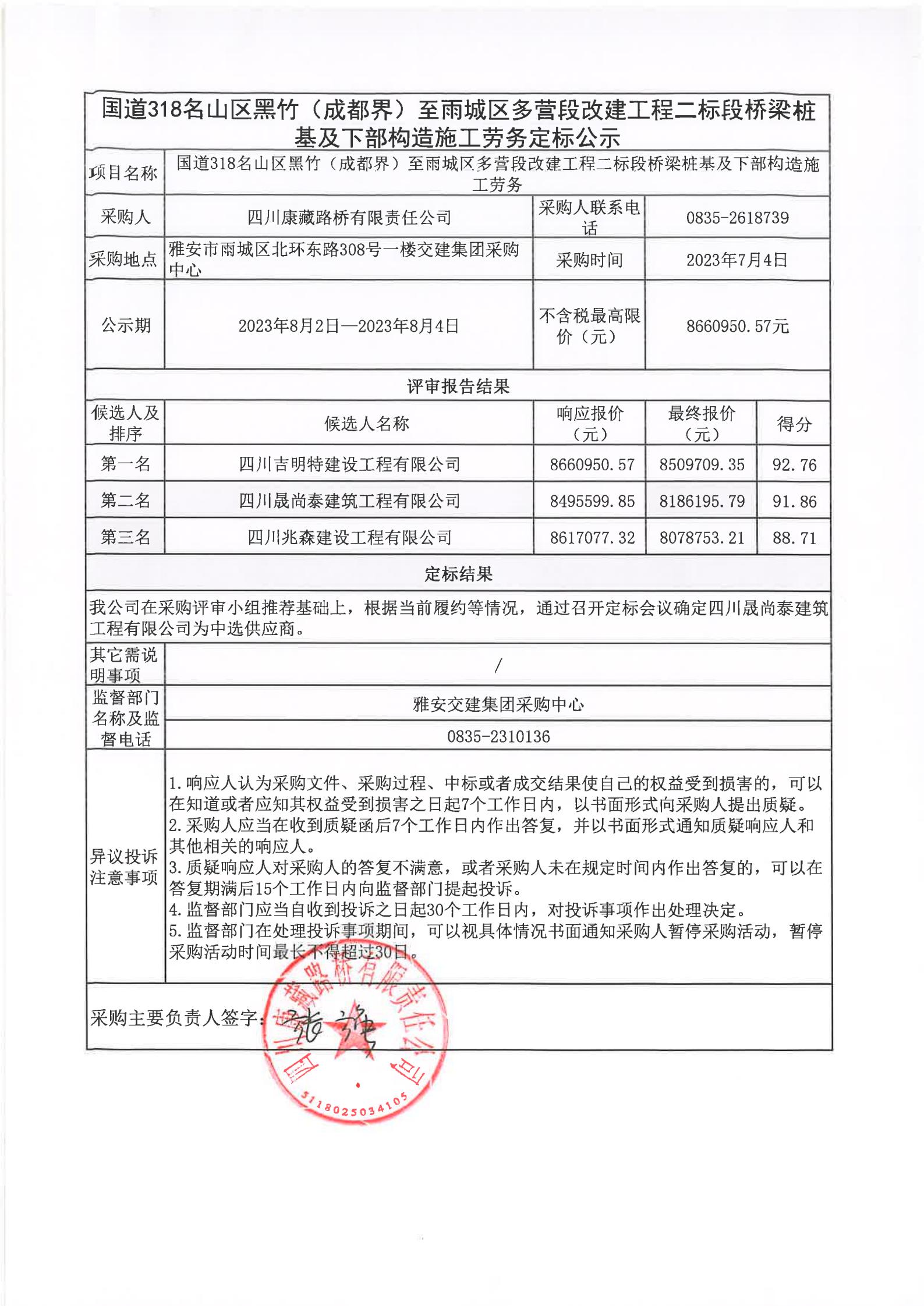 四川康藏路橋有限責(zé)任公司國道318名山區(qū)黑竹(成都界)至雨城區(qū)多營段改建工程二標(biāo)段橋梁樁基及下部構(gòu)造施工勞務(wù)定標(biāo)公示