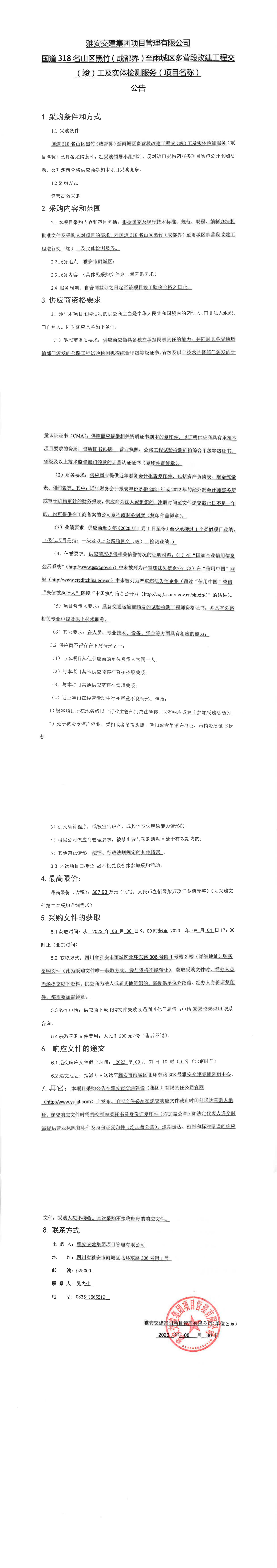 雅安交建集團(tuán)項(xiàng)目管理有限公司國(guó)道318名山區(qū)黑竹(成都界)至雨城區(qū)多營(yíng)段改建工程交(竣)工及實(shí)體檢測(cè)服務(wù)(項(xiàng)目名稱(chēng))采購(gòu)公告