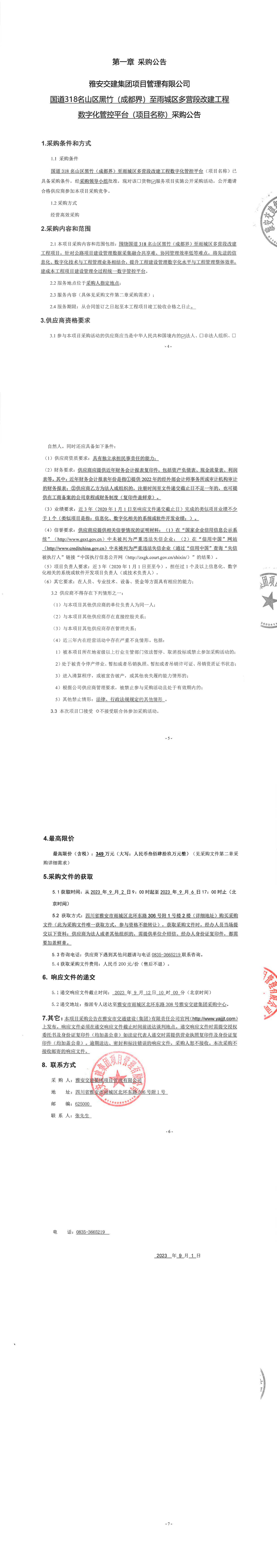 雅安交建集團(tuán)項目管理有限公司國道318名山區(qū)黑竹(成都界)至雨城區(qū)多營段改建工程數(shù)字化管控平臺(項目名稱)采購公告