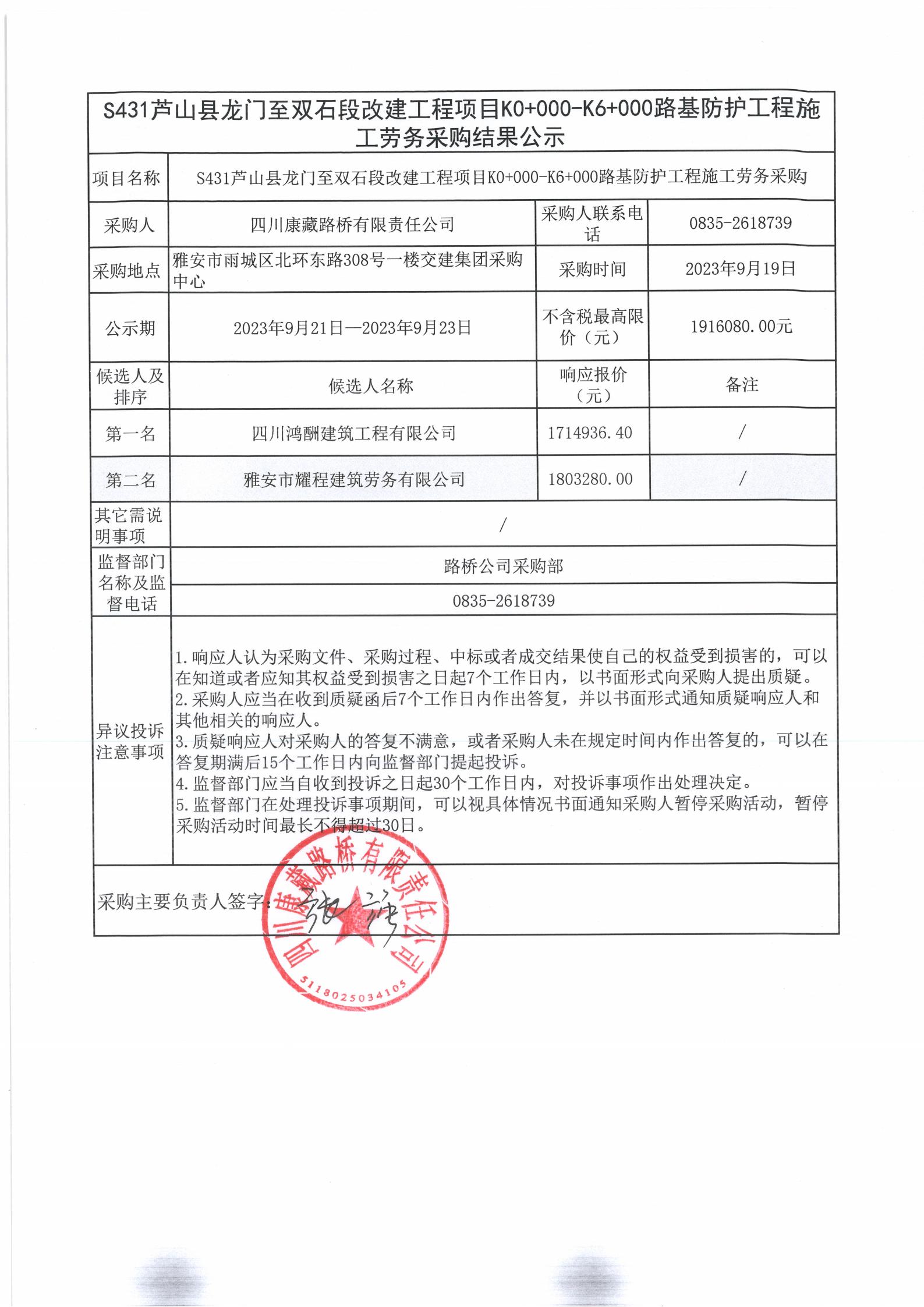 四川康藏路橋有限責任公司S431蘆山縣龍門至雙石段改建工程項目K0+000-K6+000路基防護工程施工勞務采購結(jié)果公示