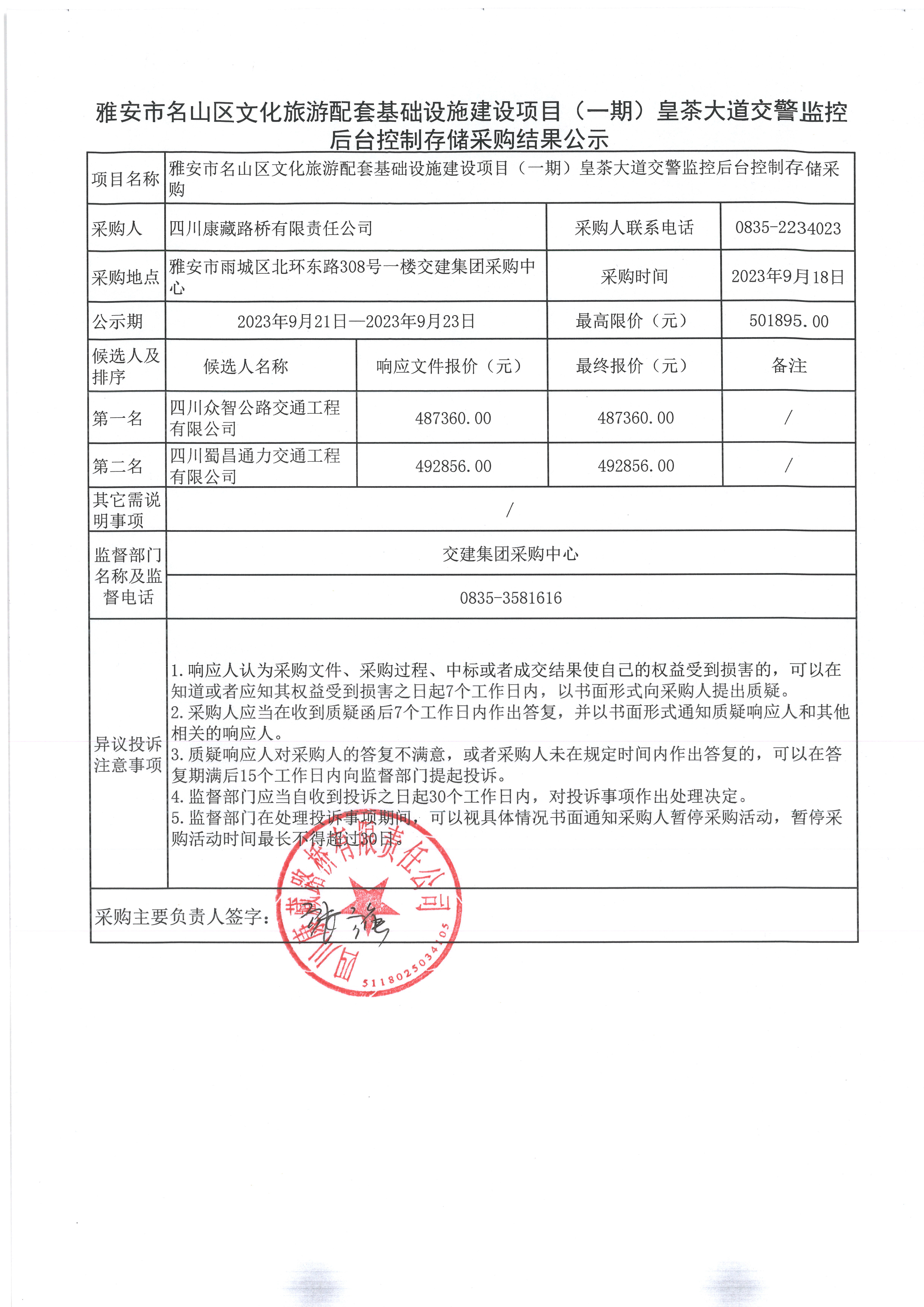 四川康藏路橋有限責(zé)任公司雅安市名山區(qū)文化旅游配套基礎(chǔ)設(shè)施建設(shè)項(xiàng)目(一期)皇茶大道交警監(jiān)控后臺(tái)控制存儲(chǔ)采購(gòu)結(jié)果公示