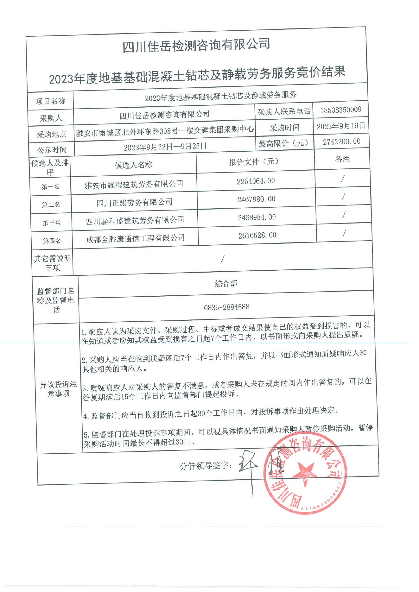 四川佳岳檢測(cè)咨詢有限公司2023年度地基基礎(chǔ)混凝土鉆芯及靜載勞務(wù)庫(kù)內(nèi)競(jìng)價(jià)結(jié)果