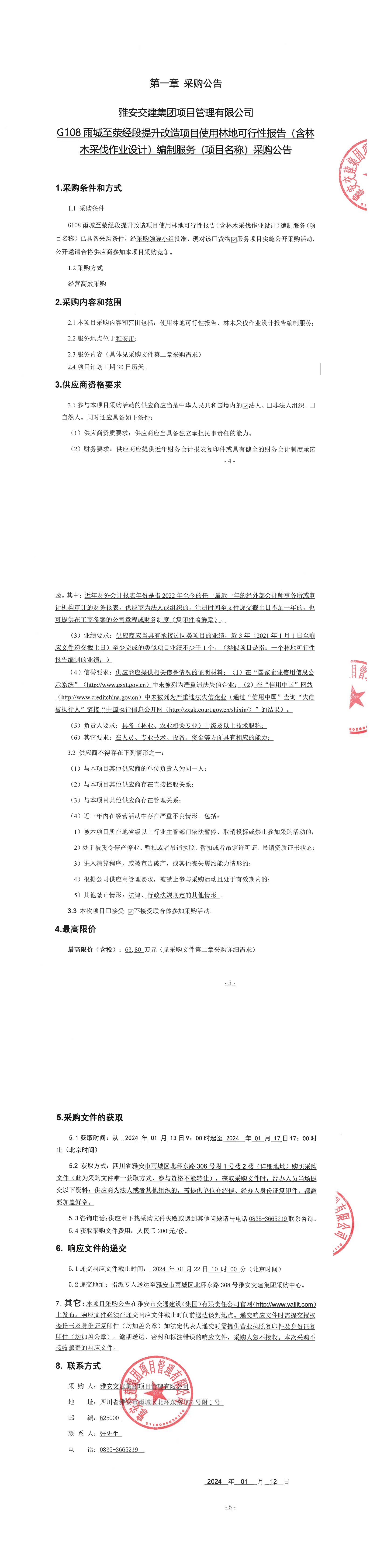 雅安交建集團項目管理有限公司G108雨城至滎經段提升改造項目使用林地可行性報告(含林木采伐作業(yè)設計)編制服務(項目名稱)采購公告