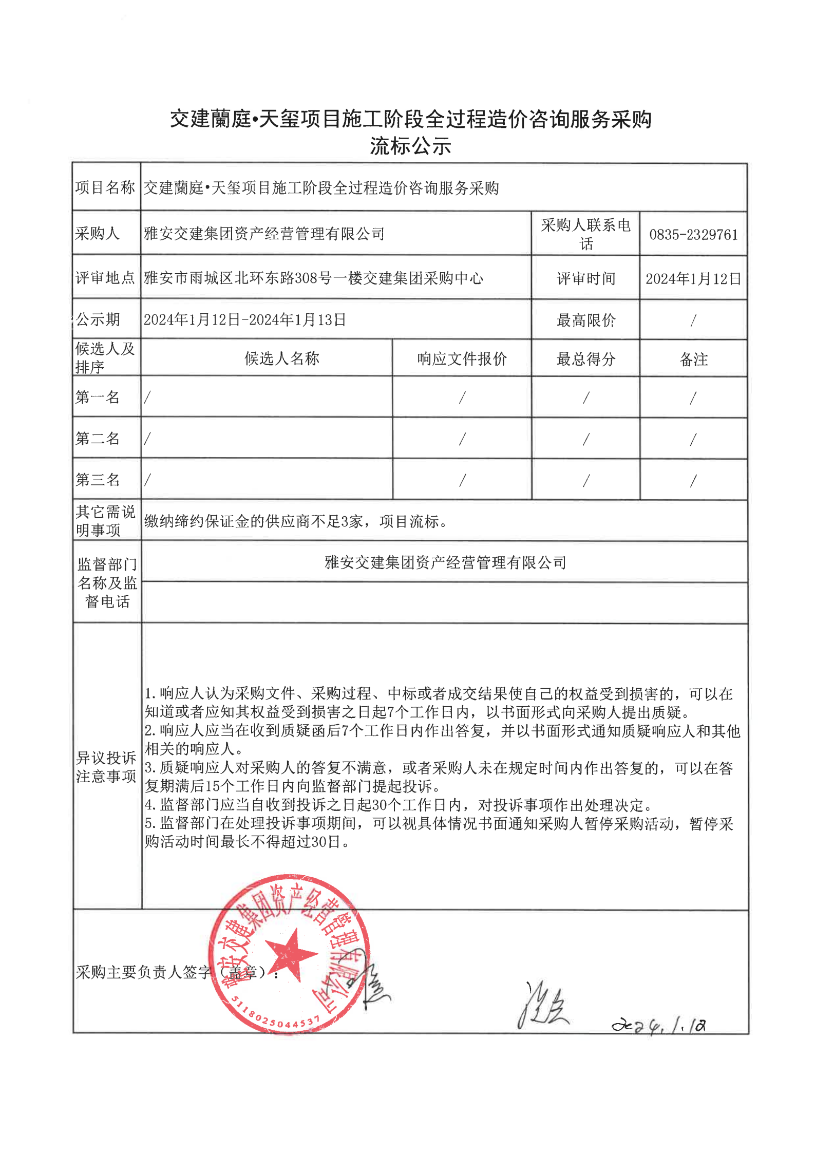 雅安交建集團資產(chǎn)經(jīng)營管理有限公司交建蘭庭·天璽項目施工階段全過程造價咨詢服務采購流標公示