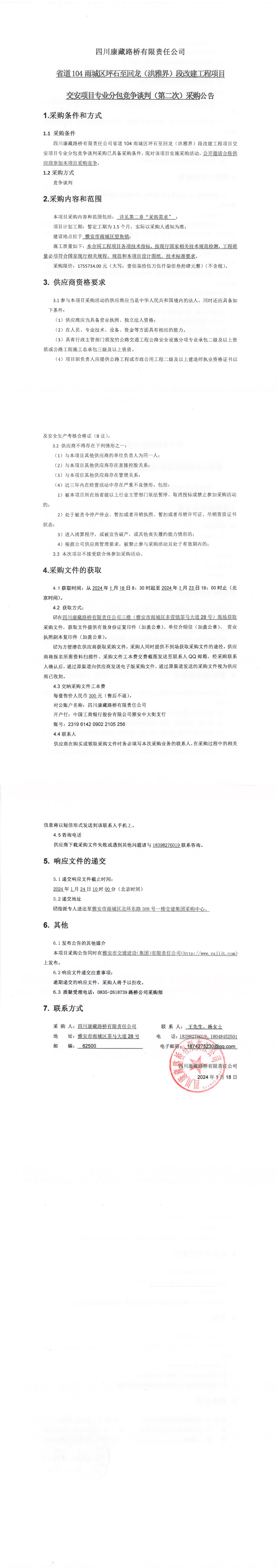 四川康藏路橋有限責(zé)任公司省道104雨城區(qū)坪石至回龍(洪雅界)段改建工程項(xiàng)目交安項(xiàng)目專(zhuān)業(yè)分包競(jìng)爭(zhēng)談判(第二次)采購(gòu)公告