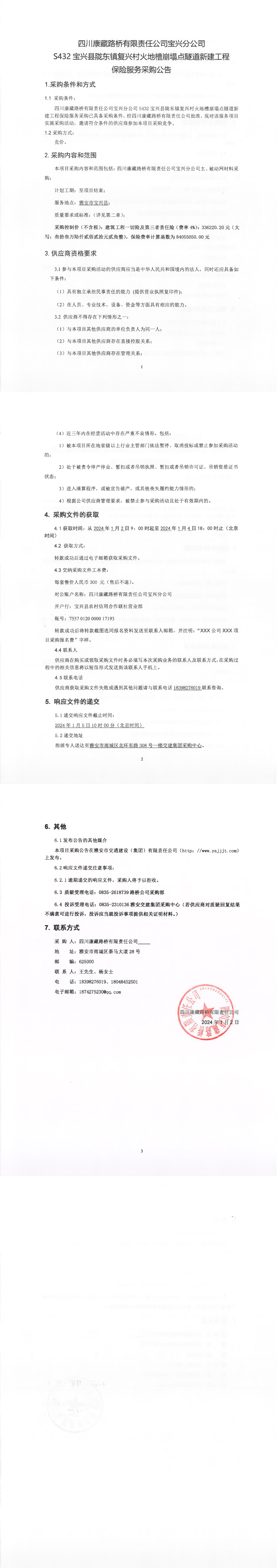 四川康藏路橋有限責(zé)任公司寶興分公司S432寶興縣隴東鎮(zhèn)復(fù)興村火地槽崩塌點(diǎn)隧道新建工程保險(xiǎn)服務(wù)采購(gòu)公告