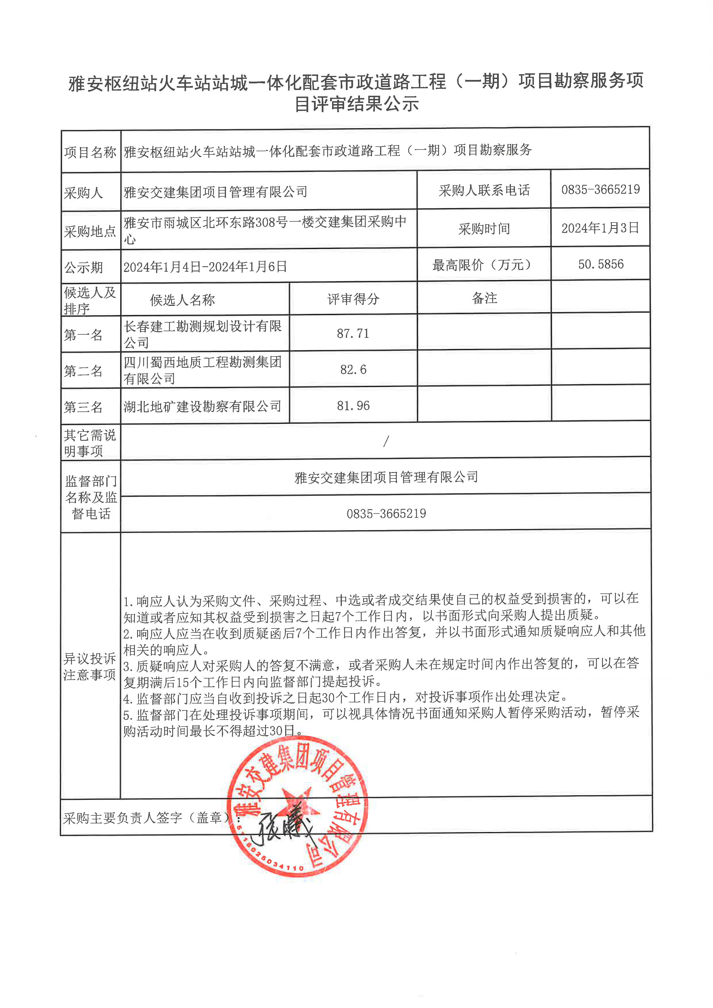 雅安交建集團(tuán)項(xiàng)目管理有限公司雅安樞紐站火車站站城一體化配套市政道路工程(一期) 項(xiàng)目勘察服務(wù)項(xiàng)目評(píng)審結(jié)果公示