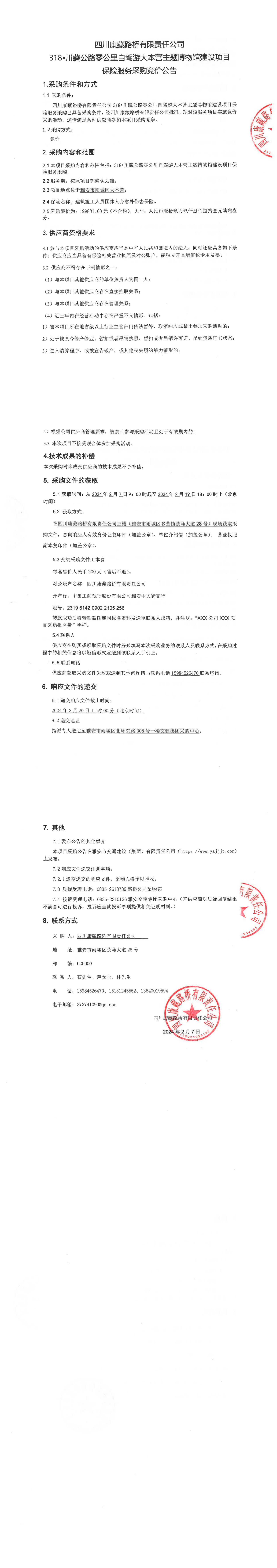 四川康藏路橋有限責(zé)任公司318•川藏公路零公里自駕游大本營主題博物館建設(shè)項目保險服務(wù)采購公告